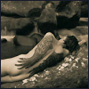 Description: Head and right shoulder of young man with long hair, lounging on his left side, with mouth & nose covered by his shirt.